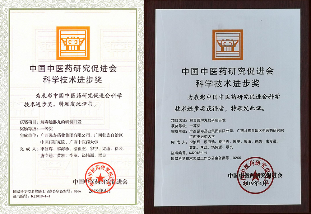 廣西強(qiáng)壽藥業(yè)集團(tuán)有限公司獨家研發(fā)生產(chǎn)的治療非淋民族藥——解毒通淋丸榮獲2018年中國中醫(yī)藥研究促進(jìn)會科技進(jìn)步一等獎(省部級獎項,一等獎項類別中排名第1位)。