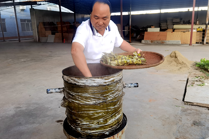 (李浪輝將桑寄生茶放進(jìn)蒸爐蒸煮)